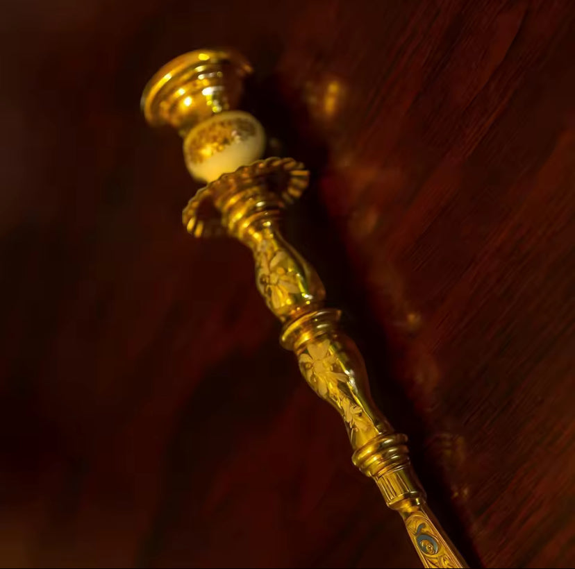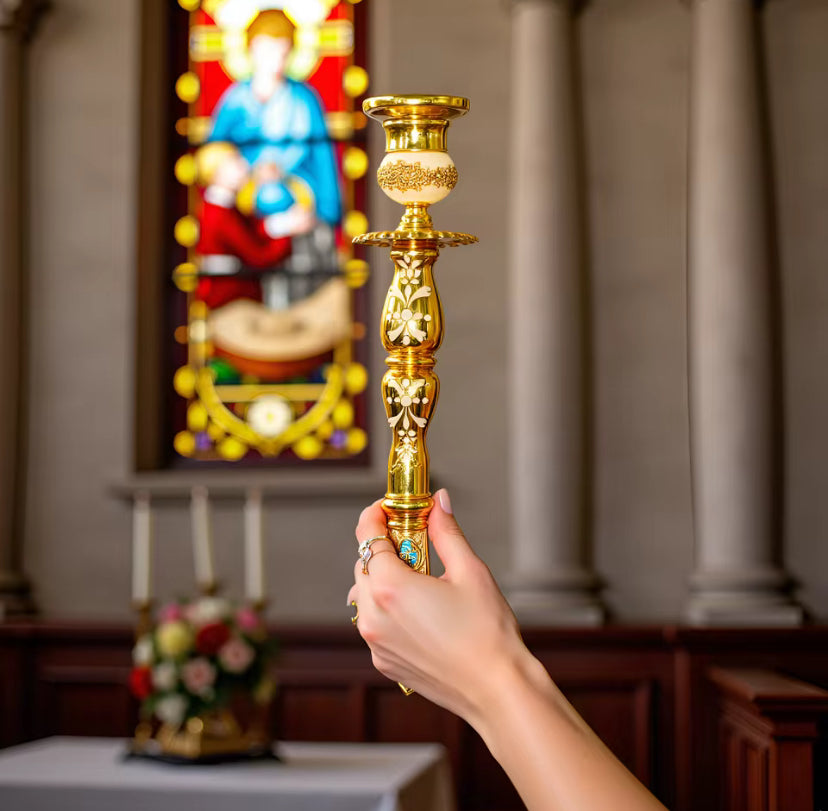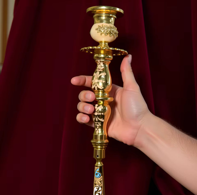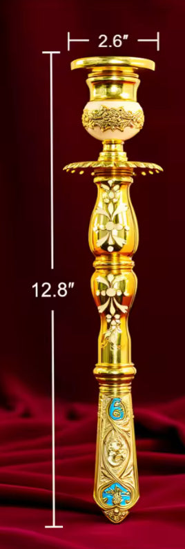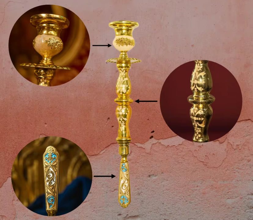 Deze sierlijke kaarsenhouder combineert elegantie met spiritualiteit. Gemaakt van duurzame materialen met vergulde accenten en gedetailleerd houtsnijwerk. Een prachtige toevoeging aan elk interieur of religieus ritueel.