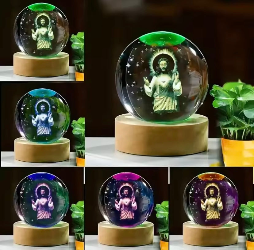 Elke bol bevat een zorgvuldig laser-gesneden christelijk symbool, dat in het glas zweeft alsof het door God zelf verlicht wordt. Het is niet zomaar een decoratie, maar een spirituele herinnering aan hoop, liefde en geloof, perfect om rust en licht in huis te brengen.
