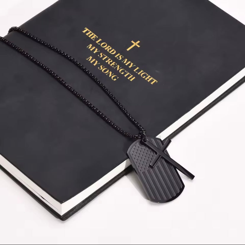 Zwarte roestvrijstalen dog tag ketting met kruis en Amerikaanse vlag
