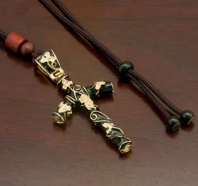 Deze metalen ketting met emaille kruis hanger is een verfijnd accessoire dat elegantie en symboliek combineert. De hanger heeft een uniek ontwerp met wijnranken en bladmotieven, afgewerkt met glanzend emaille voor een stijlvolle uitstraling. Geschikt voor dagelijks gebruik of als opvallend detail bij een bijzondere gelegenheid.