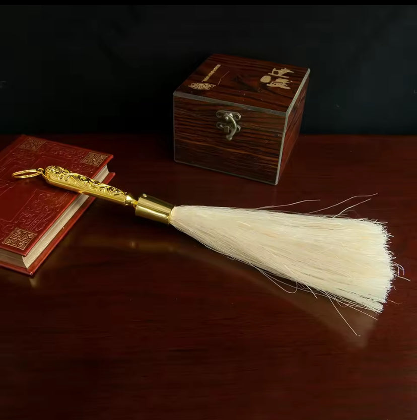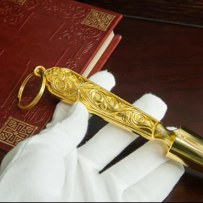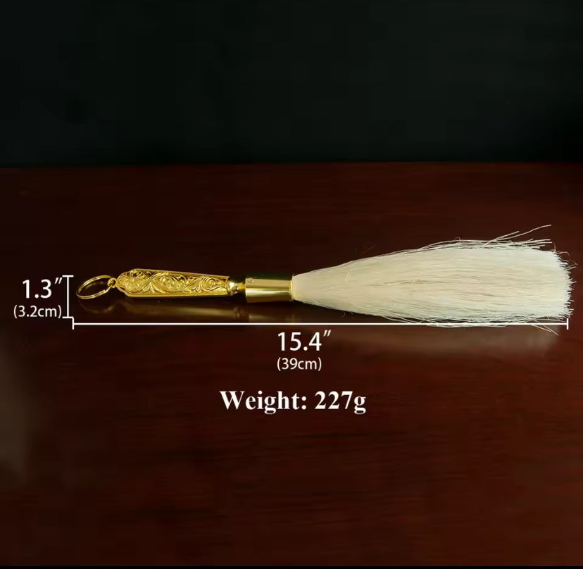 Deze rituele sprinkler is een zorgvuldig vervaardigd hulpmiddel, ideaal voor ceremonies en rituelen. De vergulde afwerking geeft het een stijlvolle en klassieke uitstraling.