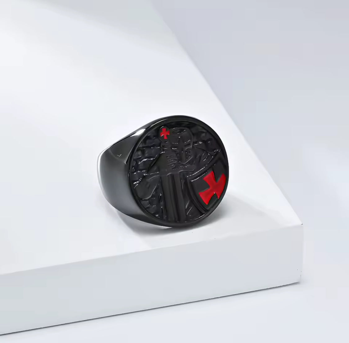 Draag de kracht en geschiedenis van de ridderorde met deze heren Tempelierskruisschildring, een indrukwekkend sieraad dat stoerheid en spiritualiteit combineert. De ring is gemaakt van hoogwaardig roestvrij staal, voorzien van een 18K goudlaag, en valt direct op dankzij zijn royale 22 mm brede schildvorm. Het Tempelierskruis – een krachtig historisch symbool – staat centraal en benadrukt moed, geloof en eer.